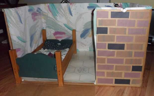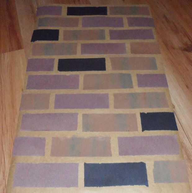Usé varios tonos marrón y negro de papel de construcción para fabricar ladrillos (acerca de 2 "x 8"). Pegué a un pedazo de papel de embalaje marrón en forma de ladrillo. Este papel de ladrillo estuviera pegado a la parte delantera exterior.