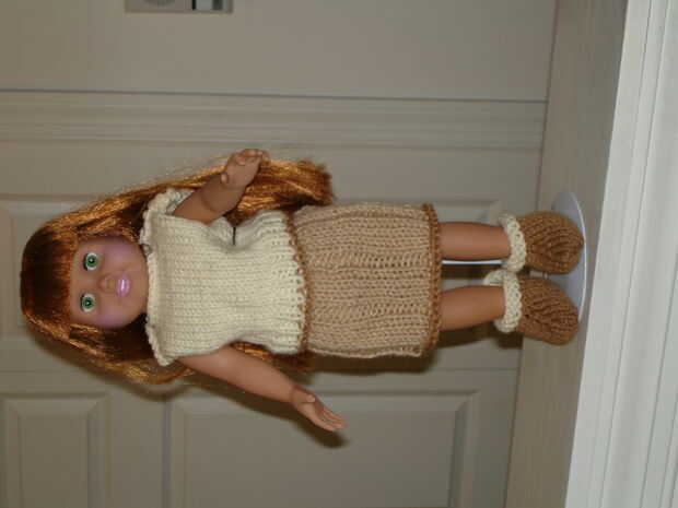 nuestra nieta Brooke tiene una muñeca American Girl Allison. Allison es necesario ropa así con cierta marca de fábrica del León "Elección de Vanna" hilo y #8 agujas armé un conjunto que incluye una falda tan y cáscara de Marfil, botas y un suéter de la Rebeca. La falda y shell fueron modificadas de un viejo patrón de la muñeca Barbie, mientras que el patrón de suéter de la Rebeca de Bernat libro #530112. La combinación parece funcionar bien, y no cambiaría nada.
