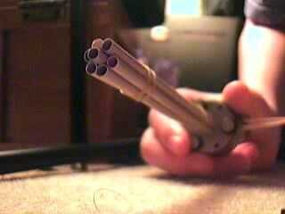3, empujar el cañón de retenedor de centro en la torunda hasta abajo, pero sin tocar el motor, causa que a retrasarlo o evitar que se gire, sujetar el interruptor (no tengo uno, o que hacer pero no quiero soldar ahora) y conectar a la batería, no exceda de 5 voltios o 12 voltios , que no exceda tampoco, a menos que usted tiene montones y montones de bandas de goma o cinta en los barriles, se vuelan aparte.