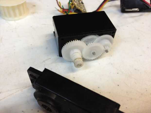 TL; DR: arrancar toda la electrónica además del motor, conecte conductores directamente al motor, corte la lengüeta de retención en el engranaje grande.