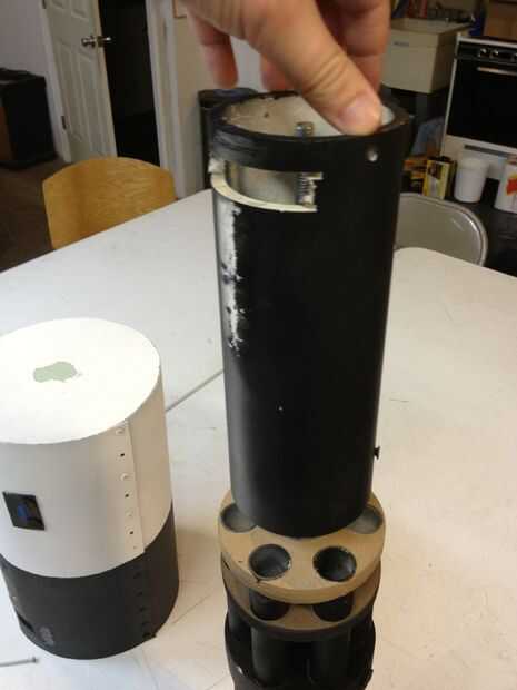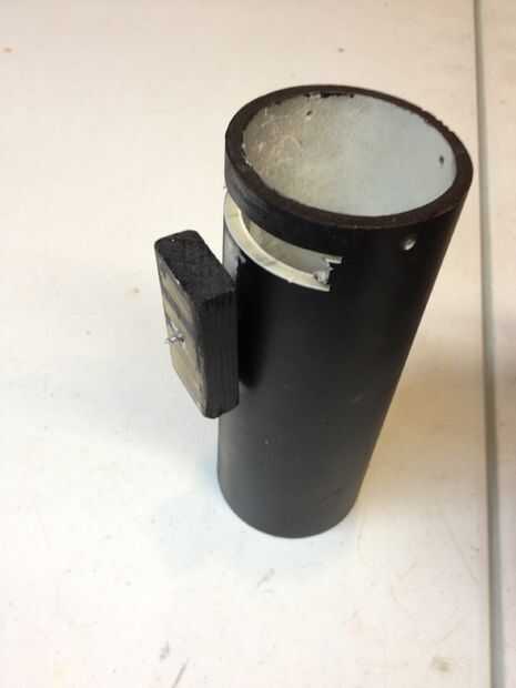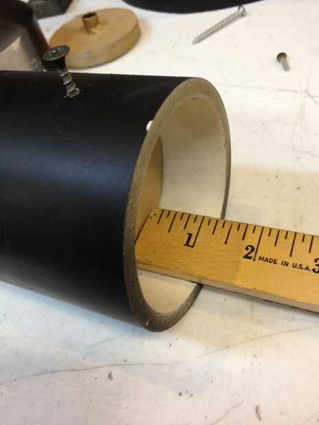 Unos 2,75" nuevo haga un orificio en la parte superior (frente a lado de la raja) de un destornillador caber a través. En el otro lado haga un agujero para un tornillo de drywall, meter la mano en el tubo, conseguir el tornillo en el agujero en la parte inferior, luego use un destornillador por el orificio en la parte superior para sujetar a la columna vertebral de la pistola. Usted querrá Pretaladre al espaciador también para no dividir.