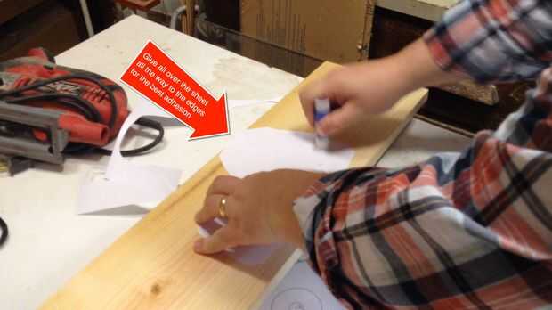 Tomar cada recorte de plantilla y cubrir la espalda de cada uno con su palillo del pegamento. Tratar de conseguir como mucho del papel, hasta los bordes del papel. Hará mucho más fácil de cortar la madera si la plantilla se une firmemente a la madera.