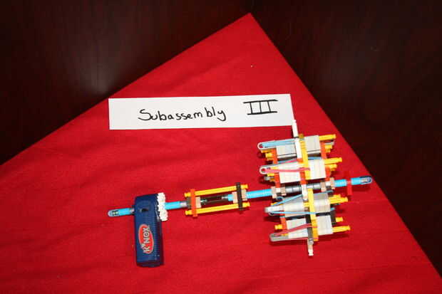 esto es una ametralladora de k'nex. Se dispara bastante lejos y es divertido de usar. Tiene una tasa firering 6,7 o 8 vueltas por segundo. Construirlo y probarlo, es una muy divertida pistola. Por cierto, yo no soy responsable de lo que se hacer con