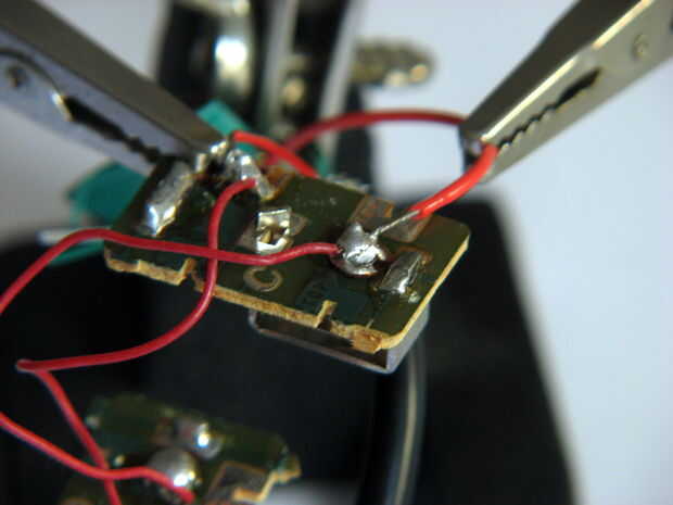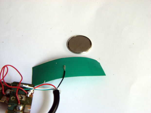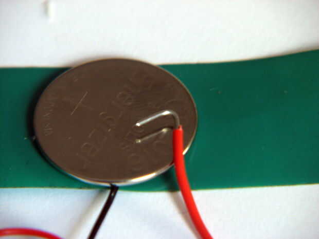 4) tira de los extremos de un pedazo corto de alambre. doblar un extremo del alambre y colocar sobre el lado '+' de la batería.
