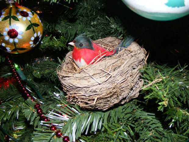 los 18 años nuestra Ave nidificante ha adornado nuestro árbol , ha sobrevivido a los 3 movimientos y 4 árboles y todavía trae disfrute anualmente cuando el árbol se viste a todos los que les resulta. ¿Qué árbol decorado es completa sin un pájaro o pocos?