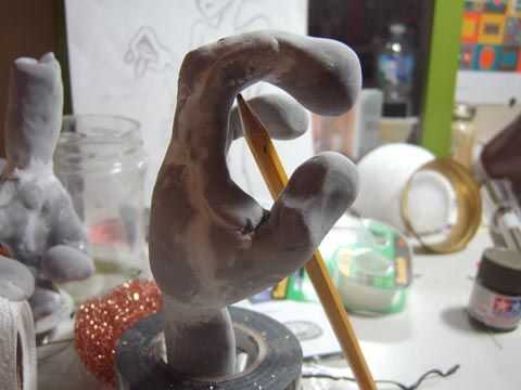 C. forma de las manos. Debo hicieron un esqueleto de alambre para los dedos, pero la arcilla es