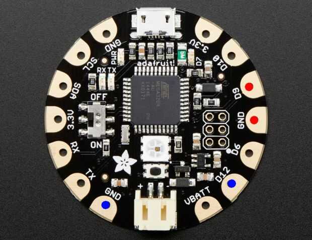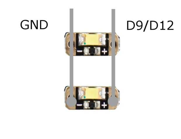 Si no es alternando el lado izquierdo par LED encontré que el hilo de D12 funcionaría sobre el pin VBAT de la Flora en la ocasión. Asegúrese de que el hilo no toque las otras patas además de uno su atado a.