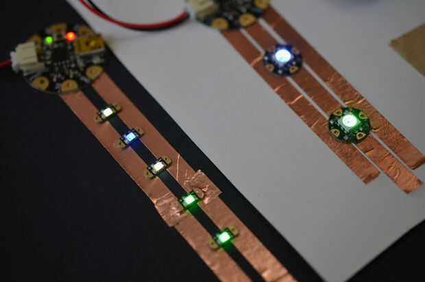4. usando el diagrama otra vez, correr el GND del hilo de rosca a través del - pin del primer LED de lentejuelas y ate por el otro.