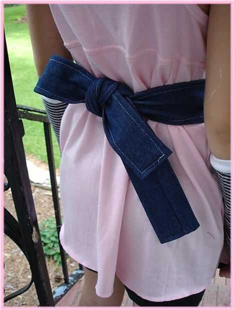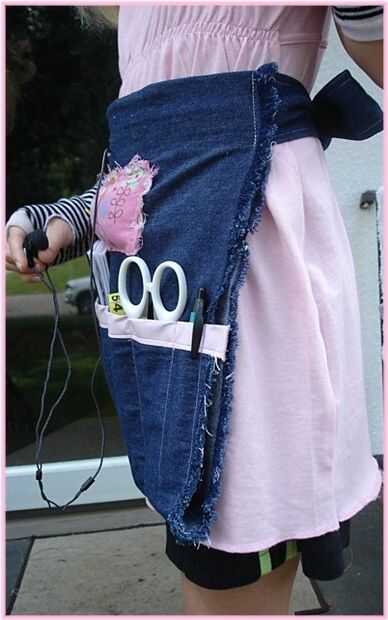 La última cosa que necesita hacer es coser una faja y cinturón simple de cualquier material que usted elija... sólo asegúrese de que esté lo suficientemente largo para atar cómodamente alrededor de su cintura. Hemos hecho nuestro unos 2-3 pulgadas ancho y doble espesor de la tela. Una vez hecho, apenas se deslice a través de la plataforma (en foldline) y atarla en! La cosí a derecha en los bordes para mayor seguridad. Disfruta haciendo tus manualidades y la costura mientras tenga todo que lo necesario, incluyendo su música, a su alcance con su compinche del"arte"!