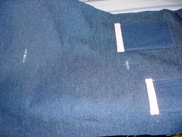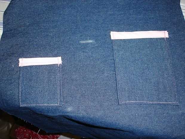 La medida desde la parte inferior de la pieza larga del dril de algodón, coser un bolsillo en la marca de 12 pulgadas y el otro en la marca de 13 pulgadas. Sólo eyeball en el espacio sino dejar un espacio en el medio porque más adelante se irán añadiendo aquí un ojal.
