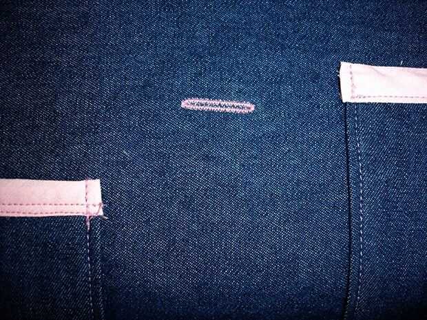 La medida desde la base, coser un ojal en la marca de 12 1/2 pulgada y entre los dos bolsillos, solo fijarse. El tamaño del ojal puede variar, pero asegúrese de que ajusta los auriculares de que elegir insertar a través! (El compañero de nave que vendo vendrá con un par de audífonos).