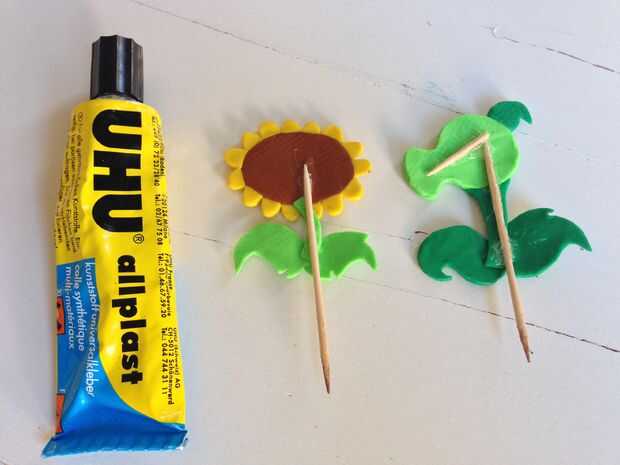 Pegue un palillo de dientes en la parte trasera. El palillo estabilizará la arcilla, pero ahora también tenemos nuestro personaje en un palillo - listo como decoración de la flor que puede ser pegada en el suelo!