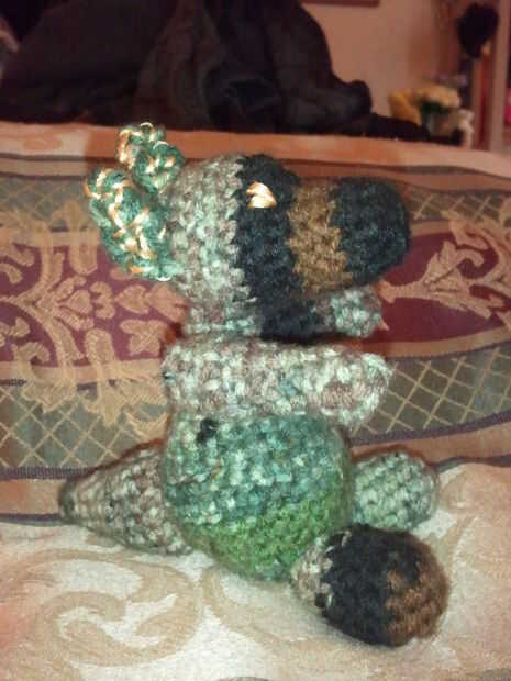 Las modificaciones incluyen: sin espinas ni los párpados, oídos punto para arriba y que utiliza un filamento doble de hilado y un hilo de macrame de oro para las orejas. He utilizado el mismo hilo de oro para coser los ojos. La cola es modificada para que sea mucho más pequeño que el patrón original.