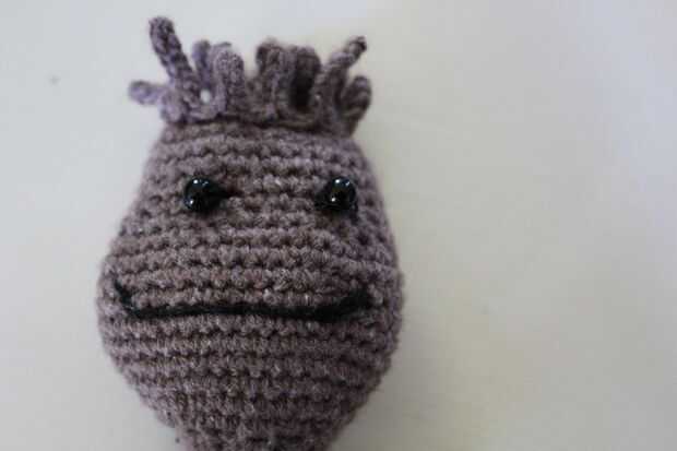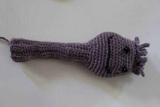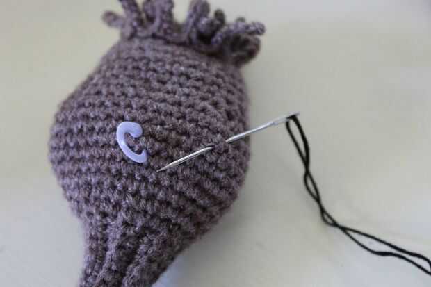 Ahora a coser en esos ojos de seguridad. Easy peasy. Usted puede necesitar una aguja con un ojo más pequeño para caber a través de los ojos. Un poco desproporcionado, lo sé, pero lindo!