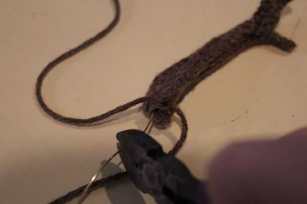 A continuación, conectarse al cable. Usé alambre de 0,81 mm. Deslícelo hacia arriba a través del brazo y corte una pulgada en la parte inferior, para que esto se puede pegar en el cuerpo una vez que se cose para arriba. Con un real (necesitarás uno con un ojo más grande para caber el hilo a través de) la aguja de coser coser el brazo al cuerpo.