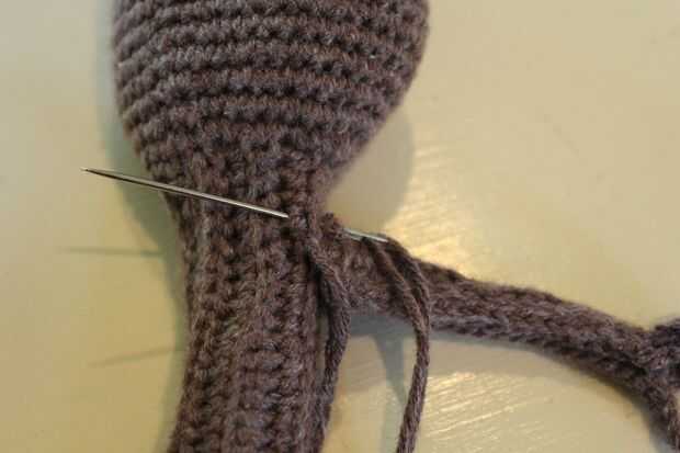 Ahora doblar la pieza por la mitad para que ronda 1 es en la parte delantera y crochet slst 19 para arriba. Coser el agujero donde el brazo con la mano. Luego puntada del azote hasta el lugar donde el brazo se conoce el cuerpo y cortar, dejando una cola larga para coser sobre el cuerpo más tarde.