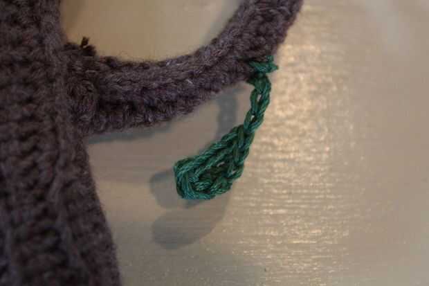 CH 5. Slst, 2 sc y 3 hdc en la última cadena. Tire del extremo del hilo para obtener la primera cadena apretada y mantenga el ganchillo alrededor, como un círculo. 2 sc, 2 slst, cadena 3. Repetir y hacer tres más. Coser las cuatro hojas sobre los dos brazos y dos lados de la cabeza.