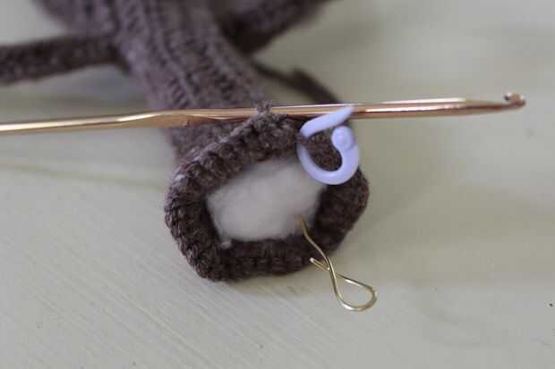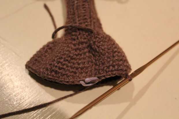 Ronda 1: Inserte el gancho en la parte inferior de Groot. Hacer deslizamiento del nudo con el hilo y pasarlo a través de su gancho. Hilo de encima y hacer su primer SC. aumento con crochets solo alrededor del borde hasta llegar a su marcador de puntada con 36 SC. [imagen]