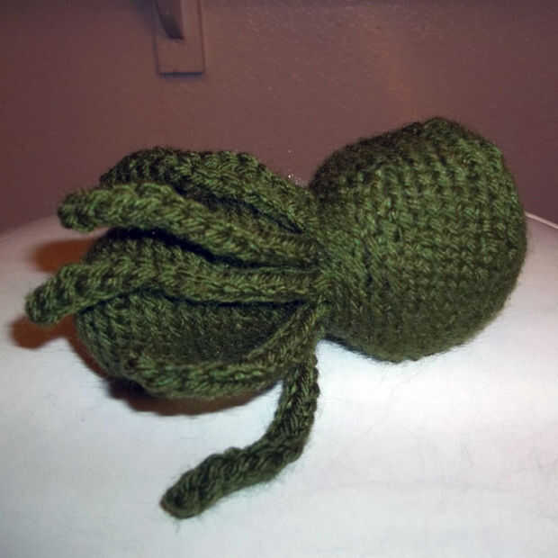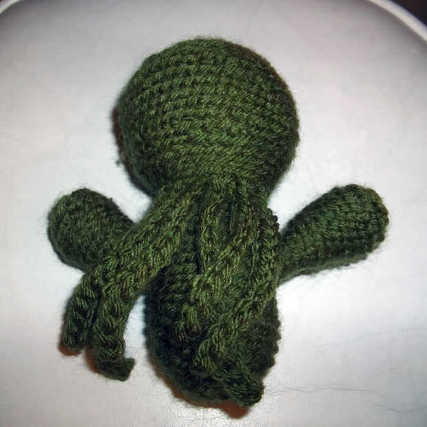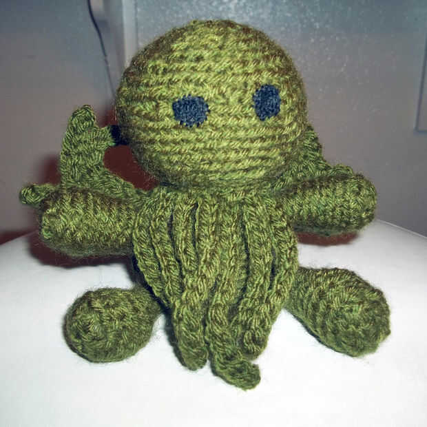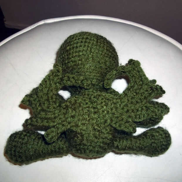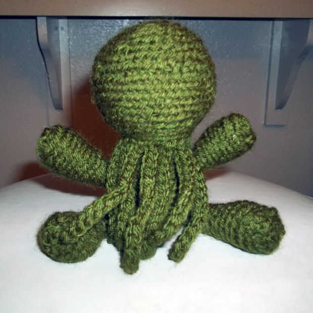 es un Amigurumi Cthulhu que hice para unos amigos como regalo de inauguración de la casa, el patrón era una combinación de http://allaboutami.tumblr.com/post/16498866712/dragonpattern y http://cthulhucrochet.blogspot.ca/2008/05/tiny-cthulhu-free-patt