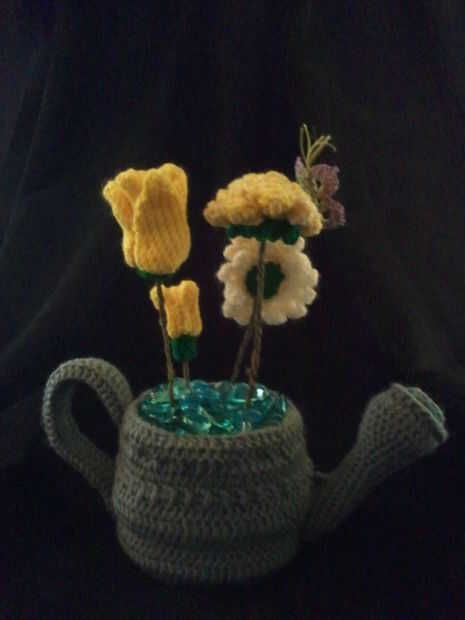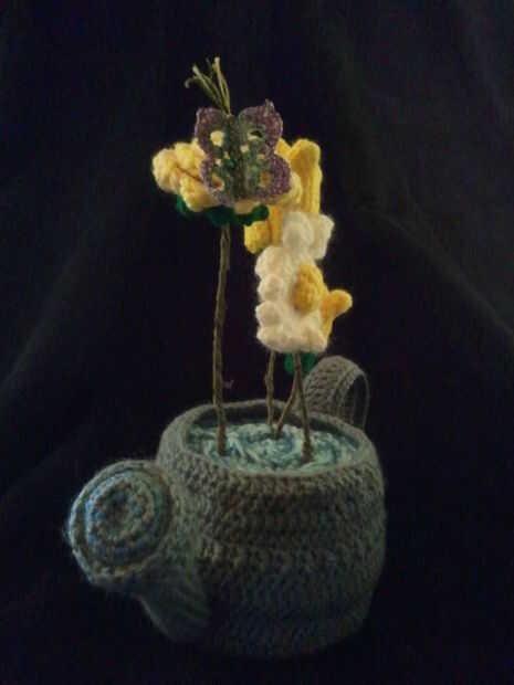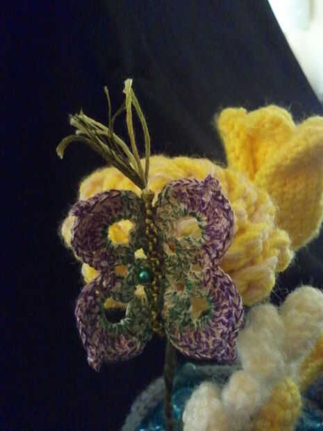 Marcadores de colores la mariposa con la tela y colocarse con sólo un alfiler, así que ella podría moverse alrededor de la pieza como ella deseaba. Usé círculos de espuma de poliestireno y piedras para llenar la olla, asegurar el círculo superior de espuma de poliestireno con una gota de pegamento caliente antes de coser en el disco de ganchillo 'agua' en la parte superior. Tiró unas piedras de cristal bastante azul en la parte superior de la variedad, puede mostrarse con o sin ellas. El mango tiene un doble largo de alambre dentro para darle forma. Los tallos de la flor son alambre de arte, la clase que viene envuelta y se ve todo stemmy. Asomó a través de la espuma de poliestireno en la pieza y hasta en las flores, con una gota o 2 de pegamento caliente para mantenerlos firmemente en su lugar.