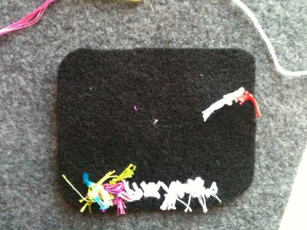 3. para que la luz de encendido y flechas blancas en el lado de la pantalla, iniciar con hilo rojo y bordar una pequeña plaza de la luz (también se podría hacer un nudo u otra puntada, lo que crees que se ve mejor). Usando hilo dental blanco, hacer tres > en una fila después de la luz. (imagen 3)