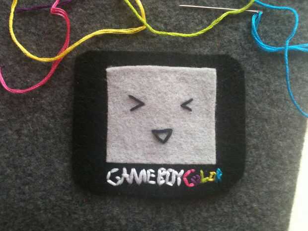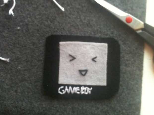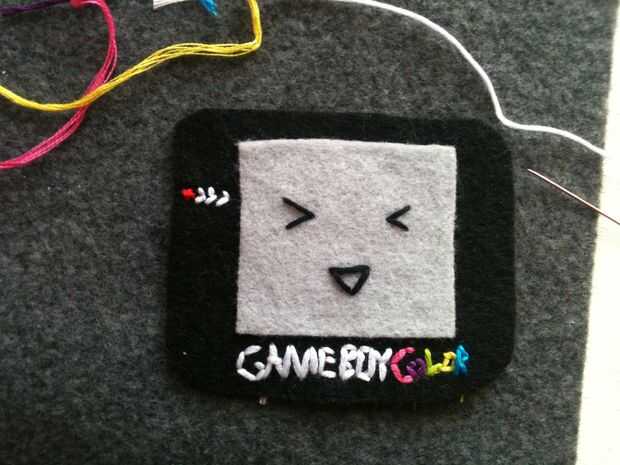 1. con el blanco seda, borda Game Boy bajo la pantalla, asegúrese de dejar suficiente espacio para añadir el resto del nombre. Esto puede ser bastante difícil y a menos que seas un trabajador de clase mundial de aguja, más probable que no el texto no sea perfecto, pero está bien! Sugiero que corte el hilo después de terminar cada letra a su gusto. De esta manera, si te das cuenta que has cometido un error en una letra que puede rasgar con cuidado el hilo hacia fuera sin tener que deshacer sus puntadas. Tenga cuidado de no tirar o romper el fieltro durante la costura. (cuadro 1)