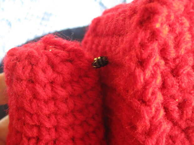 Fijar los brazos. Empuje imperdibles ojo (los previamente insertados en los brazos) a través de los lados del torso de una o dos filas hacia abajo desde el hombro.