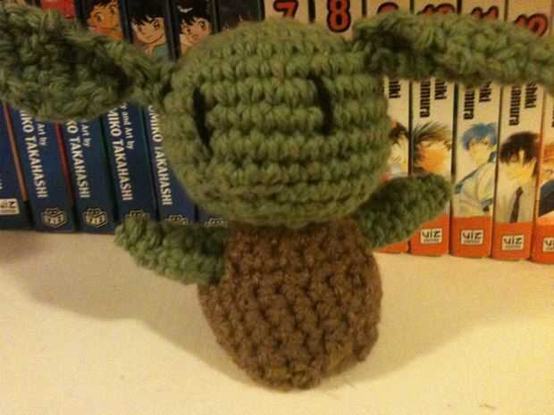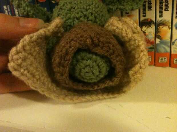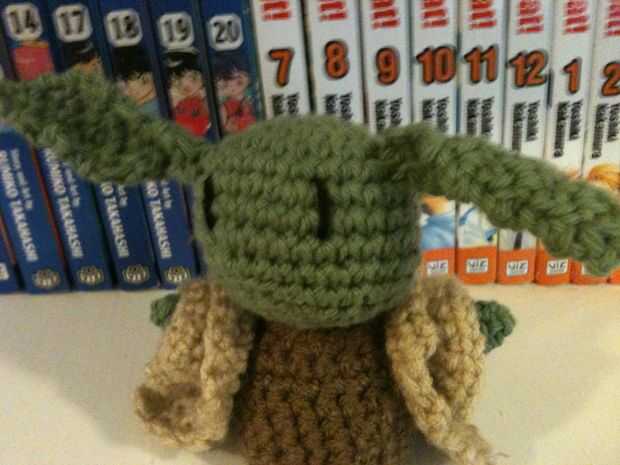 YODA el montaje: (Estoy suponiendo ya unida la cabeza al cuerpo y rellena como se indica en el patrón). Usando el mismo hilo utilizado para el cuerpo, fije las orejas a la cabeza, pellizcos las bases un poco para darles más de una oído-como mirada. Agregado los brazos a la altura deseada en el torso. Usando el hilado negro, coser ojos simples en la cara.