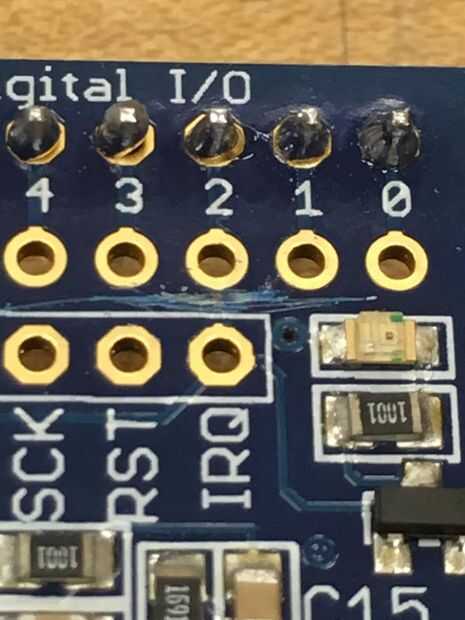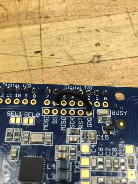El escudo de controlador NFC es el más simple de los dos escudos para la construcción. Una mayoría de él viene previamente construida, aunque varias cabeceras se deben soldar en. Corté las cabeceras para tener el número correcto de clavijas para el uso. Para ello, necesitarás uno con 6 pines, dos con 8 pernos y uno con 10 pernos. Una vez que aquellos han sido soldados en, debe cortar la conexión entre la IRQ y el pin 2. A continuación, crear una conexión a IRQ a la clavija 6, como se muestra arriba.