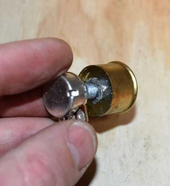 1. usted necesita quitar la parte superior de la perilla para que se pueda introducir en la cartilla dentro de la cáscara. Para ello puede utilizar un dremmel o unas tenazas pequeñas. También sería moler apagado. El aluminio es muy delgado por lo que debe salir fácilmente.