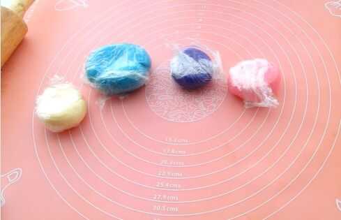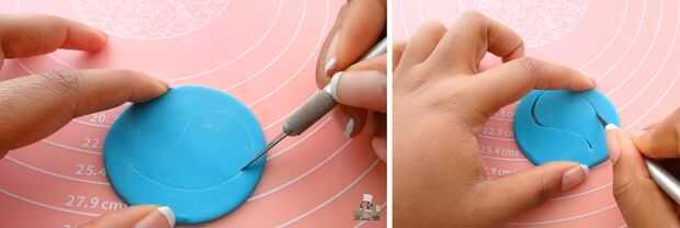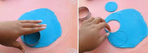 Hombre pájaro: Empezar por el despliegue de fondant azul. Utilizar un cortador de círculo del tamaño de la Magdalena y cortar tantos círculos como te gustaría hacer pájaros. Ej: 3 aves = 3 círculos de Fondant. Para el pájaro hembra, usar color de rosa.