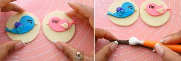 Estirar el fondant amarillo y cortar un círculo por ave. Coloque cada pájaro en un amarillo redondo y sujete con agua.