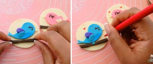 Rodillo fondant marrón en registro y guión con un tenedor o fondant herramienta para simular una rama de árbol. Coloque una rama debajo de cada pájaro. Acabar rodando dos bolitas del mismo color que el pájaro y acople a la rama como pies.