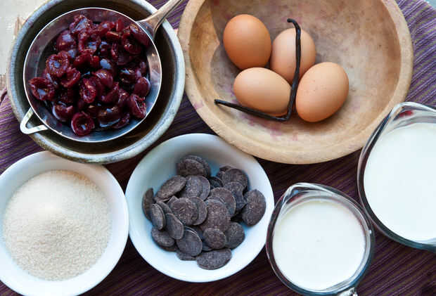 En un bol batir las yemas de huevo y azúcar. Partir la vaina de vainilla por la mitad y raspar las semillas. Añadir las semillas y la vaina a la mezcla de huevo/azúcar junto con la leche. Coloque el recipiente sobre una olla de hervir agua para crear un baño María. Batir poco a poco pero a menudo hasta que la mezcla cubra la parte posterior de una espátula, o mejor aún, tomar la temperatura con un termómetro de lectura instantáneo. Debe ser de 160 grados f el. quitar el recipiente de baño María y agregue la crema. Enfriar y transferir a una taza grande o una jarra, que hará más fácil verter en el congelador del helado. Cubra con envoltura plástica y enfriar durante la noche. Configurar la heladora, retire la vaina de vainilla a la mezcla y vierta en la máquina. Proceso hasta que se espese. (aproximadamente 20-30 minutos) Escurrir las cerezas en un colador de malla fina y cortar el chocolate en trozos de 1/4 de pulgada. Añadir las cerezas y el chocolate picado a proceso hasta que se mezcle los helados. Raspar en un recipiente congelador y congelar durante al menos 2 horas espesar para arriba.