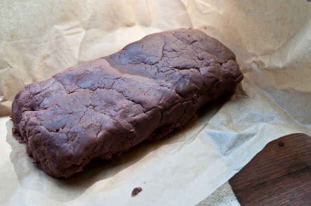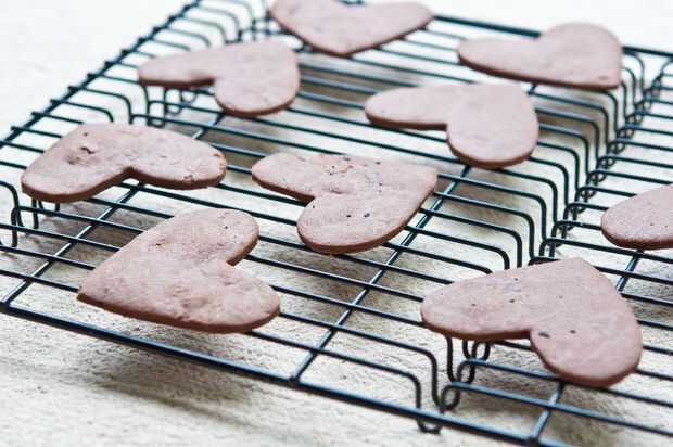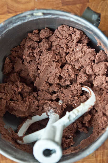 En el recipiente de una batidora estándar grande crema la mantequilla y el azúcar. Añadir el huevo y batir bien. Agregue lentamente la harina, el cacao y la sal hasta que no hay harina permanece visible. Forma en un registro, envolver en papel de pergamino y refrigera durante 30 minutos. Cortar en 4 porciones para hacer más fácil de estirar. Enrolle la masa a 1/8 de pulgada de espesor. Cortar con el cortador de galletas favorito. Usé una forma de corazón 4-pulgadas. Transferencia a una hoja para hornear forrada pergamino. y hornear durante 10 minutos. Transferir las galletas a una rejilla para enfriar.