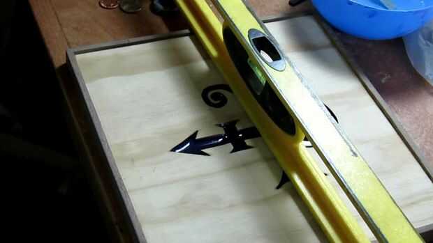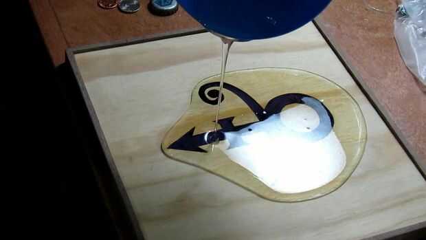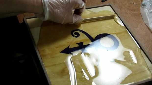Antes de comenzar este paso, nos aseguramos de que todo estaba muy limpio. Había polvo en la pieza de corte en la sierra y de la punta de lijado ligero que fue hecha. Otra vez, nos aseguramos que la pieza entera fue nivel antes de verter. Luego mezclan un lote de resina transparente y vierte sobre el panel. Para este paso nos aseguramos nuestro tiempo y los residuos de la resina que estaba presente. También nos pasó algún tiempo haciendo estallar las burbujas y empujando la resina para conseguirlo donde hemos querido. Uno de los principales objetivos durante este paso para mantener la resina limpia y clara que a veces es difícil. Todo lo que podían y aún terminaron con algunas manchas y fuzzies en él hicimos. Encubriendo mientras es curado ayuda, pero no es 100%. Esto también tendrá que curar durante unas 12 horas o menos.