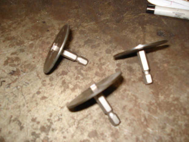 paso (2) tomé (3) 1 1/2 arandelas planas y taladrar el orificio del centro al 9/64ths de una pulgada. La i presiona en 3 pedacitos de destornillador inalámbrico en cada agujero de la arandela y tachuela los soldados en el lugar.