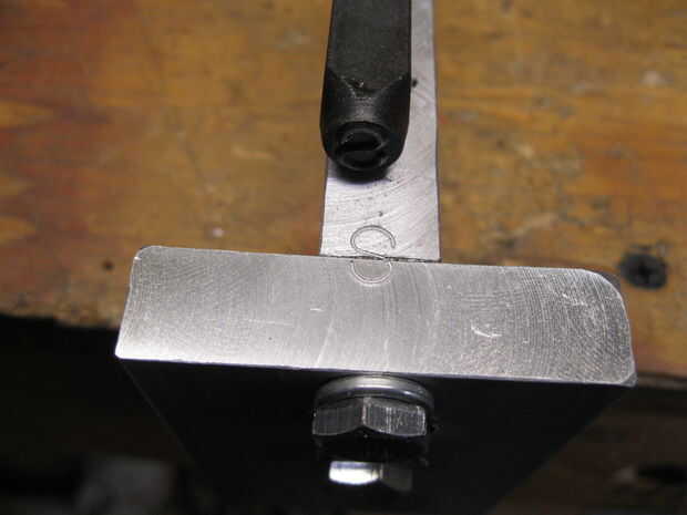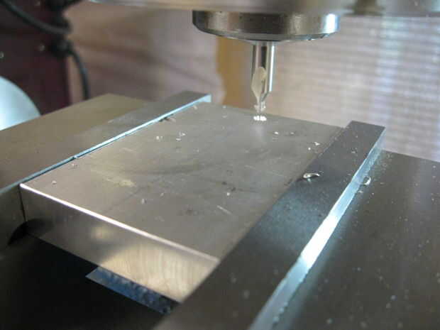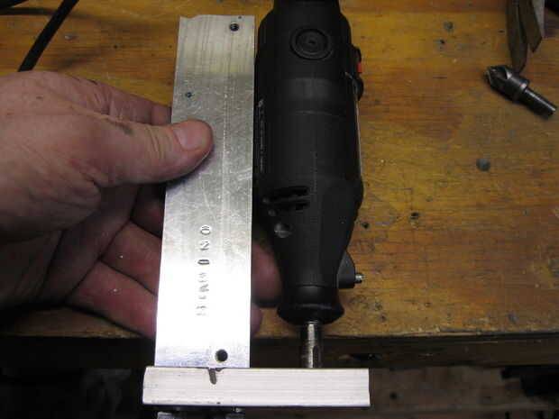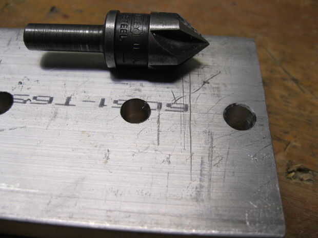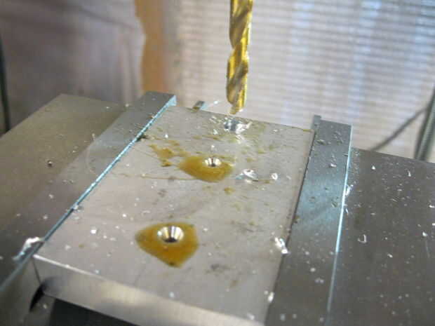 Carga un taladro #3 centro en un collar y mueva el eje Y a la ubicación del primer agujero y bloquearlo. Usando corte taladro líquido del orificio piloto hasta que el contador del fregadero en el taladro piloto apenas bisela las piezas. Repetir este proceso para los próximos 2 agujeros.