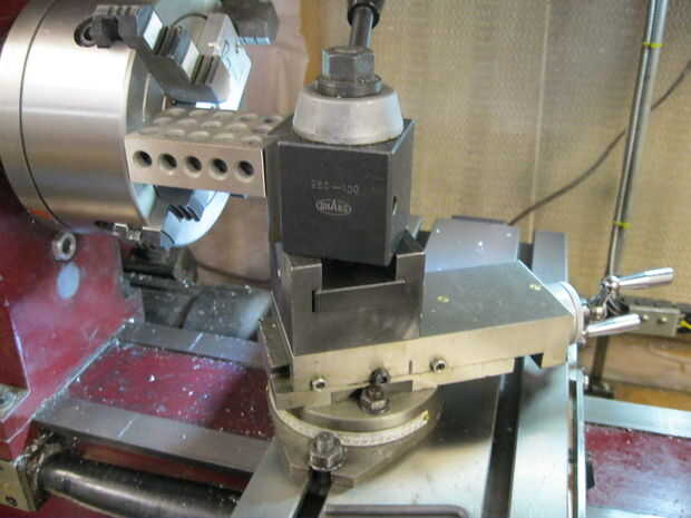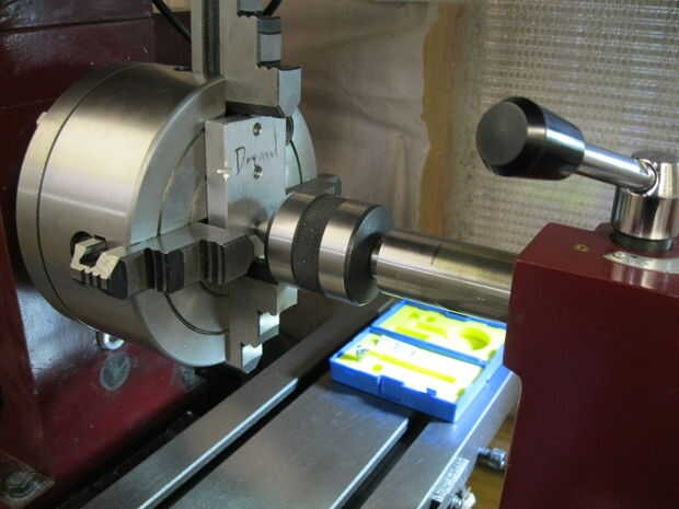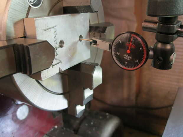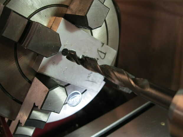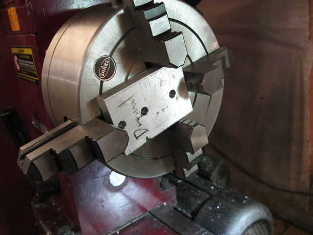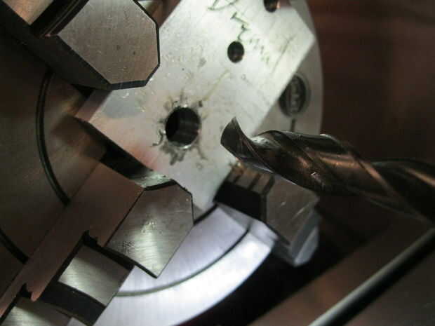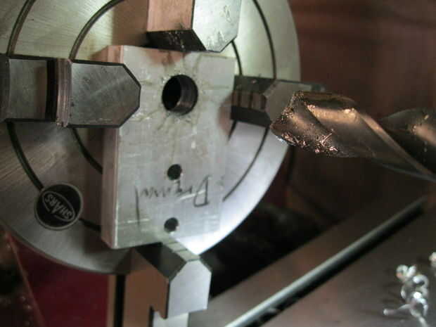 Doble primera verificar que el bloque está apretado en el mandril de 4 mordazas. Si no está correctamente apretado hacia abajo pueden ser lanzada desde el mandril al mecanizar. Configurar un portabrocas en la acción de la cola. Perfore el agujero de la Dremel con los siguientes tamaños de 3/8", 1/2", 5/8" mediante la acción de la cola y un montón de fluido de corte. Una vez hecho esto quitar el taladro y el taladro mandril y deslice la acción de la cola fuera del camino.