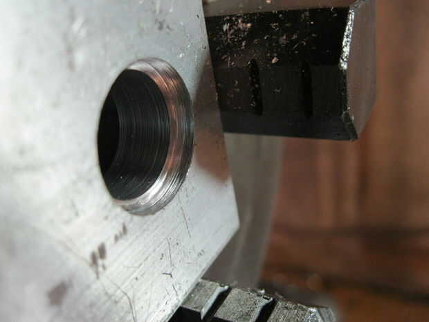Carga un 3/8" aburrido de la barra y el cortador en el poste de la herramienta. Establecen el palillo para que extienda 1/4" más allá de la parte posterior del bloque de cara. Con la máquina de la barra aburrida y sin embargo bloquear la cara. Rote el portabrocas con la mano y verifique que ninguna de las mordazas u otros elementos chocan con el poste de la herramienta o diapositiva cruzada. Detrás de la barra hacia fuera y verifique la punta de la herramienta de corte está en la línea de centro horizontal de la parte. Ajustar la diapositiva cruzada para un corte de luz y bloqueo hacia abajo. El torno y un corte de luz en toda la longitud del agujero. Parar el torno y medir el conjunto ID en el dial/DRO a esta dimensión (Asegúrese de no abrir la diapositiva cruzada hasta que esto se hace). Proceder a cortes medio toda la longitud del agujero hasta la identificación del agujero es igual al diámetro menor medida por encima. A continuación cortar el bolsillo para el hombro sin rosca de Dremel. Tomar medio pasa por la profundidad de la anchura de los hombros hasta que el ID de este bolsillo coincida con el diámetro de hombro medido por encima.