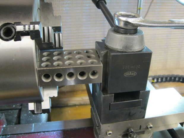 Cuadrado hasta el poste de la herramienta a la cara del mandril. Para hacer esto Afloje la herramienta post sujeción tuerca. Tomar 1-2-3 bloque y colóquelo entre la superficie plana/del cuadrado en el poste de la herramienta y la cara de la tirada del torno. Verifique que no hay suciedad o virutas están atrapadas entre el 1-2-3 bloques y la cara de mandril o el poste de la herramienta. Aplicar ligera presión en el 1-2-3 bloque utilizando el carro de plataforma para que el bloque de enganche en lugar. Apriete la tuerca de poste de la herramienta y retire el 1-2-3 bloque.