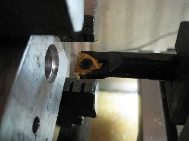 Cubra el interior del agujero y el hombro en líquido de la marca. Fluido de corte se aplican entonces avanzar la diapositiva compuesta así el cortador se tomar un corte de luz en el interior del agujero y bloqueo hacia abajo. Encienda el torno y la alimentación para sacar la cuchilla por la parte de energía. Una vez que sale de la herramienta de corte al otro lado del agujero apague el torno para detener el avance de la herramienta de corte. Desbloquear y retraer la corredera compuesta por lo que la corte no en contacto con las paredes del agujero. No retraiga la herramienta de corte va a arruinar la rosca debido a la reacción en el tornillo / la tuerca de la mitad. Invertir el torno y permitir que la alimentación para extraer la barra de taladro del agujero. Usando un hilo Calibre Verifique la afinación de las arboledas cortado por el primer paso. Si no coinciden la rosca medido anteriormente Verifique su cambio de marchas / palancas de configuración. Si correcto repita las siguientes operaciones hasta que la profundidad de rosca coincida con el diámetro menor mide por encima.