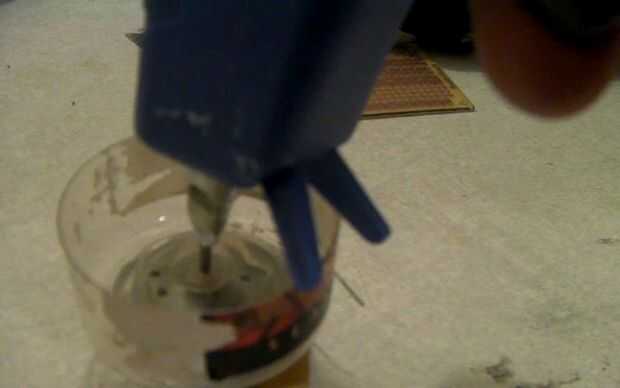 Lugar un poco pequeño de pegamento caliente a la extremidad del eje motor y coloque las cuchillas hacia abajo el eje hasta la mitad luego agregar el pegamento adicional al árbol y del blad para asegurarse de que todo se mantiene juntos.