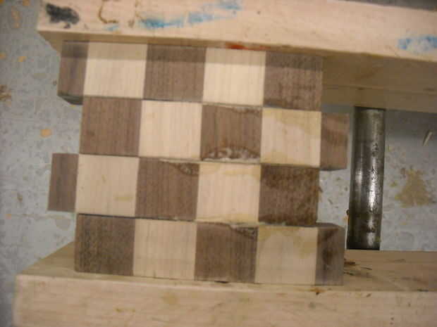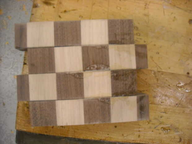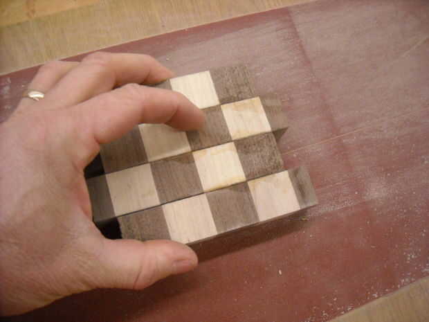 Cada pieza segunda del tirón para que la madera contrastante hace un patrón ortográfico.