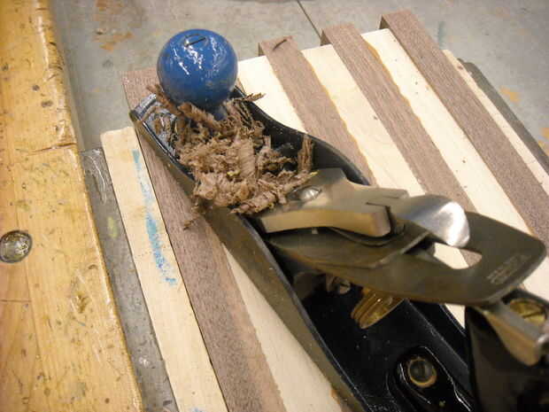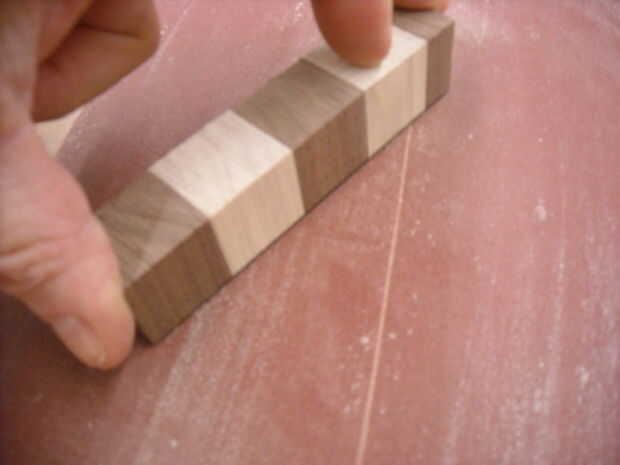 Una vez seco uso el tablero lijado para que la superficie plana y perfecta. Evitar la handplane en este punto porque los granos de madera son por todo el lugar y ' cepillado sería un desastre para los niños.