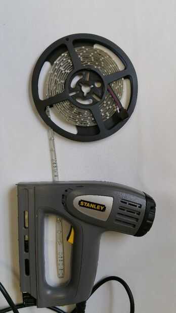 Poner la tira de LED interior del marco, utiliza una pistola de grapas para sujetar la tira de led en lugar como en el pasado he encontrado que cuando caliente la banda vendrá a.
