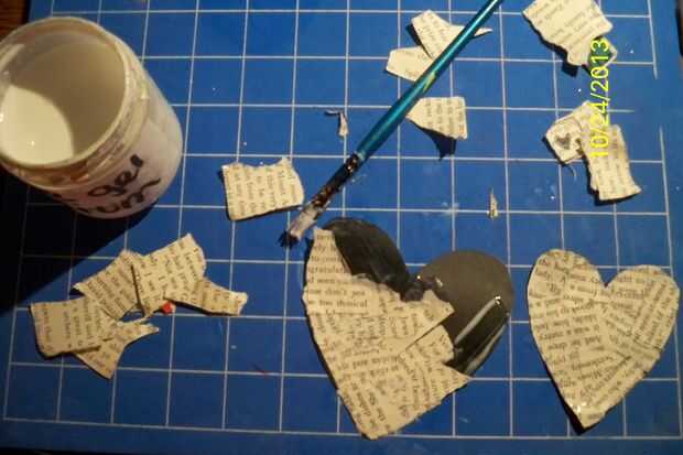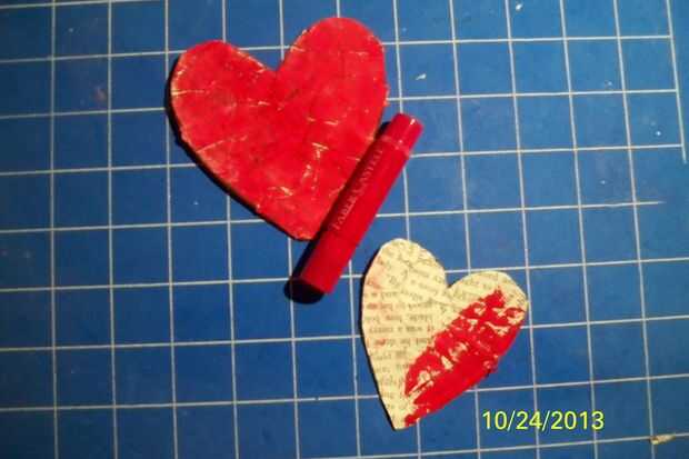 Paso 4: cortar 2 corazones de cartulina. collage con algún papel de libro antiguo y tose woth de color rojo helados. y cubierto con una capa de medio mate. seco que tjhose cumplir. luego escribí las palabras se encuentra en el corazón grande y mina en el pequeño.