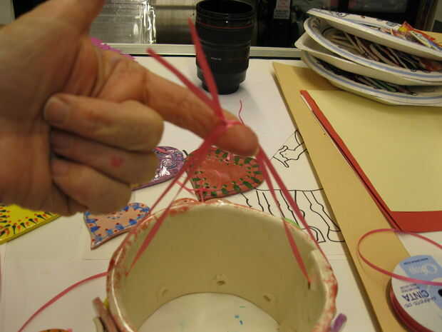 atar una longitud más larga de la cinta a través de los orificios superiores del cilindro. luego atar cada hebra alrededor de la parte inferior del soporte.