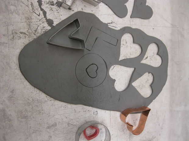 rodillo más arcilla y empezar a cortar los corazones que necesitas para tu móvil de amor. Utilicé las letras L O V E, para mejorar mi diseño. También corté varios corazones extra pequeños para decorar de la forma del cilindro en la parte superior.