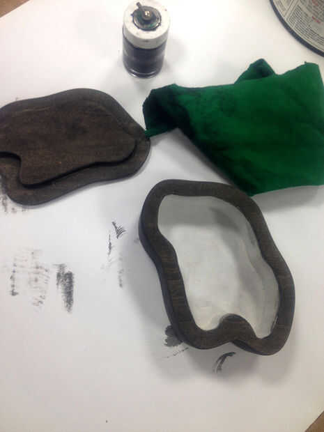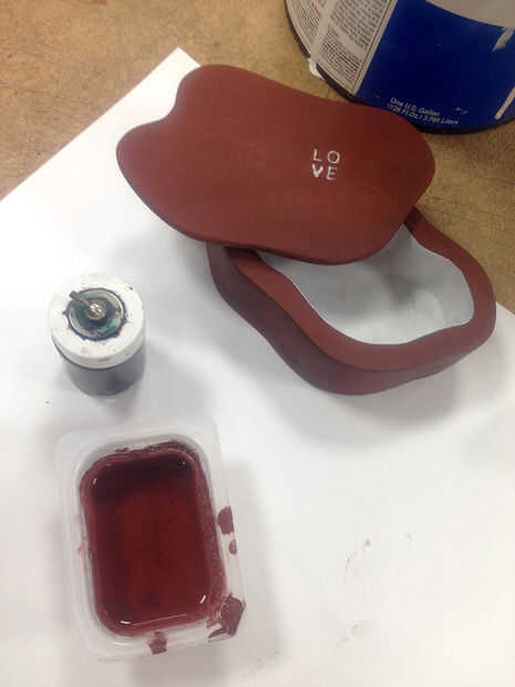 Este paso permite mucha creatividad. Personalmente, yo limpiar todo (excepto la parte interior) con tinta de la India para conseguir un color oscuro. Lijar con 220 golpes de grano por el grano áspero relieve. Pintura de leche rojo oscuro pinté todo con un trapo viejo. Antes de que se secaba quitar la pintura de leche sobrante para revelar la oscura abajo de la tinta de la India. Después de que fuera completamente seco, tomé una toalla limpia y usando la presión había pulido toda la superficie frotando duro... esto le da un suave cerca de perfecto acabado. Para completar la aplicación de la pintura pinta el interior con tres capas de pintura acrílica blanca y lijar entre capas con grano 150 o 220. Para añadir un divertido toque a la parte superior tomó cuero carta golpes y coloca la palabra L.O.V.E. en el top y pintado también el guión con pintura acrílica blanca.